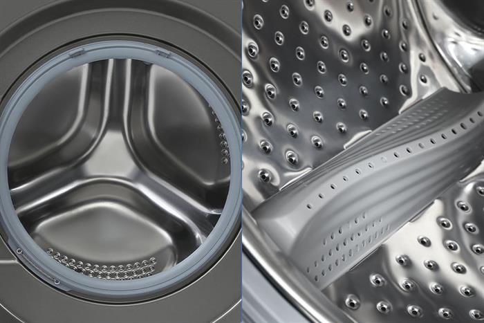 Phần lồng giặt được làm từ thép không gỉ, có khả năng chống ăn mòn, hạn chế cặn bẩn tích tụ. Cửa lồng rộng 50 cm hỗ trợ thao tác bỏ và lấy đồ giặt nhanh chóng, kể cả với các loại đồ cồng kềnh như chăn, mền, áo khoác dày,…