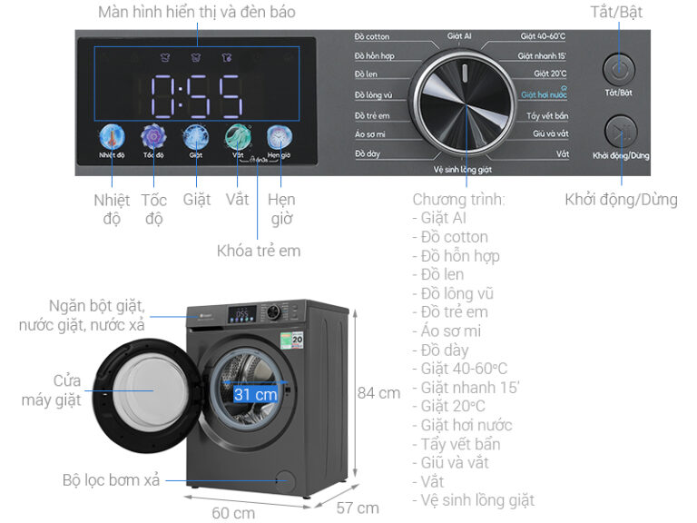 - Hỗ trợ các tiện ích hiện đại: hẹn giờ giặt, khóa trẻ em, thêm đồ khi đang giặt,…