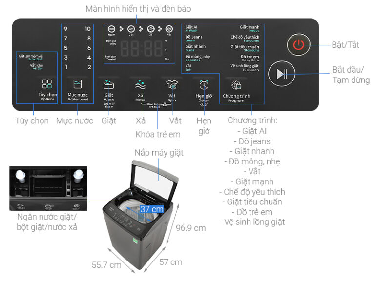 – Tích hợp sẵn 10 chương trình hoạt động phù hợp cho nhu cầu giặt giữ khác nhau: Giặt thường, giặt nhanh, giặt mạnh, giặt AI, đồ trẻ em,… (xem thêm chi tiết tại thông số kỹ thuật). Chương trình giặt nhanh giúp bạn giảm thời gian và chi phí giặt giũ.