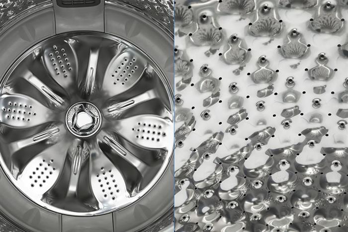 Lồng giặt thép không gỉ đảm bảo độ bền khi tiếp xúc nước và chất giặt tẩy, đồng thời hạn chế bám cặn sau thời gian dài sử dụng.
