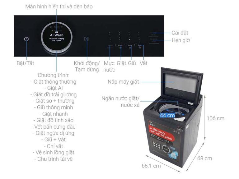 Trong hệ thống chương trình, giặt AI (AI Wash) là chế độ hỗ trợ tối ưu hóa quá trình giặt dựa trên cảm biến tải. Sau khi đo khối lượng và đặc tính quần áo, máy sẽ điều chỉnh chuyển động lồng giặt phù hợp. Cách vận hành này giúp cân bằng giữa hiệu quả làm sạch và mức độ tác động lên sợi vải.