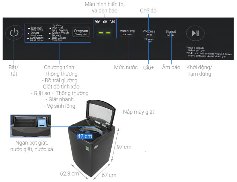 – Bảng điều khiển nút nhấn có màn hình hiển thị với chú thích song ngữ Anh – Việt rõ nét cho bạn tiện theo dõi và chọn chương trình chính xác.