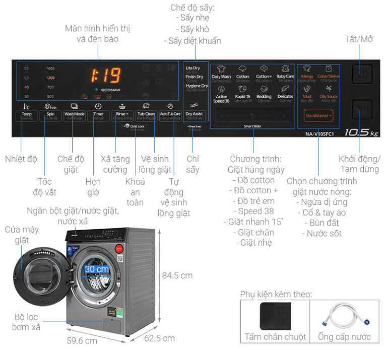 – Khối lượng giặt 10.5 kg và sấy tiện ích 2 kg đáp ứng nhu cầu giặt giũ cho gia đình có trên 7 người hoặc những gia đình có ít người nhưng có nhu cầu giặt giũ cao vẫn có thể sử dụng sản phẩm.