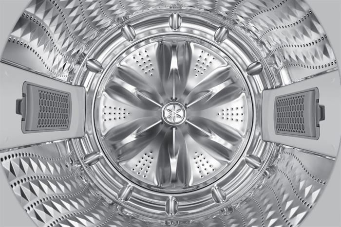 – Máy giặt sở hữu thiết kế cửa trên với lồng đứng quen thuộc, kết hợp kiểu dáng cứng cáp, màu sắc trang nhã và nắp kính chịu lực hiện đại, tạo điểm nhấn cho không gian giặt giũ.