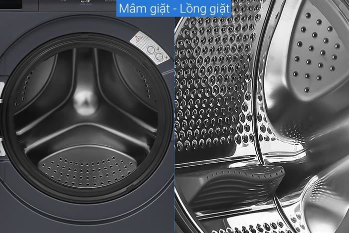 – Lồng giặt làm từ thép không gỉ bền đẹp, hạn chế bám cặn và chống ăn mòn hiệu quả, trong khi cửa máy làm từ nhựa kết hợp kính cường lực giúp tăng độ an toàn và chống va đập trong quá trình sử dụng.