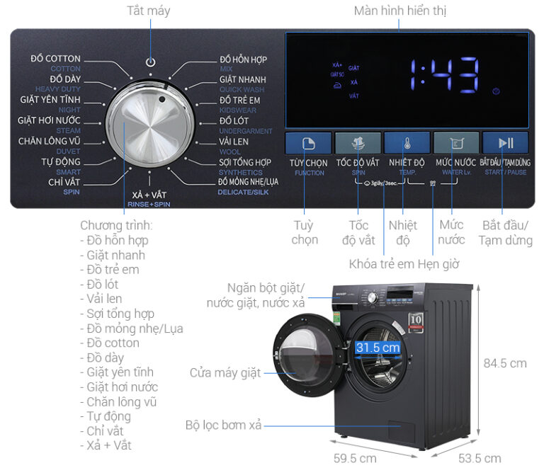 – Tự kiểm tra lỗi cho phép máy giặt Sharp tự động phát hiện sự cố và hiển thị mã lỗi để người dùng dễ dàng nhận biết và xử lý.