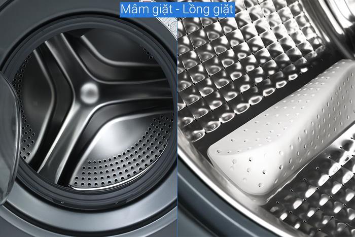 – Lồng giặt được chế tạo từ thép không gỉ cho độ bền cao và chống bám bẩn hiệu quả. Vỏ máy làm từ kim loại sơn tĩnh điện tăng tính thẩm mỹ, dễ lau chùi. Cửa kính cường lực chịu lực tốt, bảo vệ an toàn trong quá trình sử dụng.