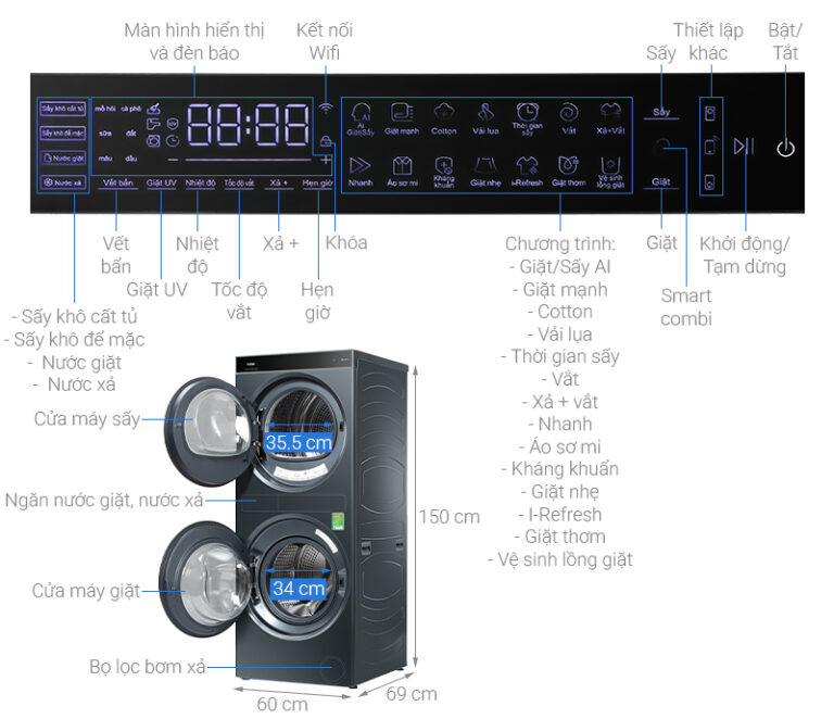 – Bảng điều khiển cảm ứng hiện đại hiển thị tiếng Việt, có màu sắc sống động và dễ thao tác, nhờ đó người dùng theo dõi trạng thái máy một cách trực quan.