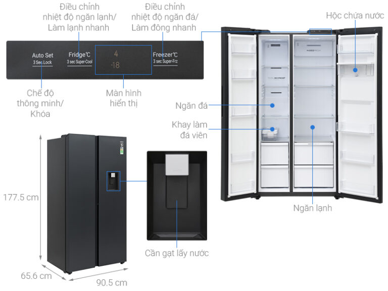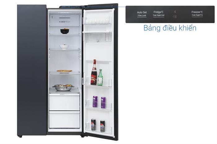 - Kiểu tủ Side by Side, dung tích sử dụng 569 lít phù hợp gia đình trên 5 thành viên.