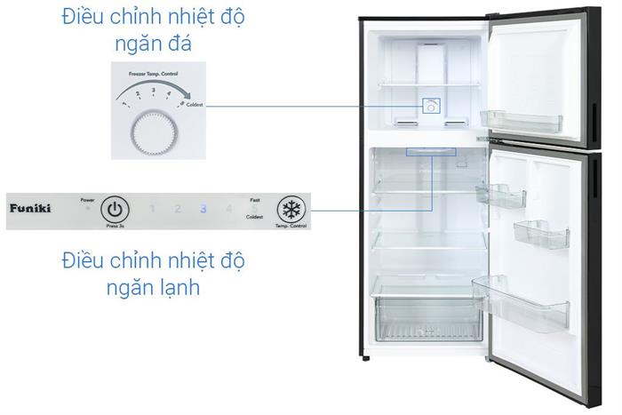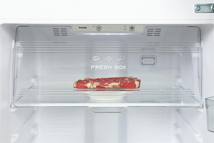 Tủ lạnh Funiki có kiểu dáng ngăn đá trên – 2 cánh quen thuộc, thao tác lấy thực phẩm thuận tay và phù hợp nhiều không gian bếp, đặc biệt với gia đình có nhu cầu trữ đồ vừa phải.