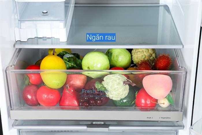 – Ngăn lạnh được thiết kế nằm ở trên ngăn đá giúp bạn không phải cúi người để lấy thực phẩm. Ngoài ra ngăn rau củ Fresh Zone bên trong ngăn lạnh còn giúp bạn dễ dàng bảo quản các loại thực phẩm như trái cây và rau củ.