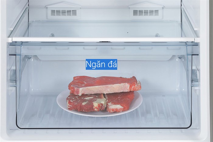 – Ngăn đá có dung tích 97 lít, gồm có các kệ chia làm các ngăn cùng với hộp làm đá tự động và ngăn chứa.