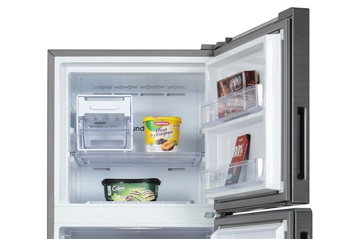 – Tích hợp khay làm đá xoay có thể linh hoạt nhiều vị trí trong tủ tối ưu không gian trữ đồ.