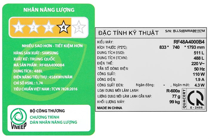 - Dung tích 488 lít chứa được lượng lớn thực phẩm, phù hợp gia đình 4 – 5 người sử dụng.