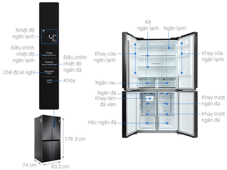 - Thiết kế Multi Door 4 cửa sang trọng với màu đen hiện đại, dễ phối trong không gian bếp.