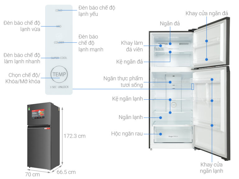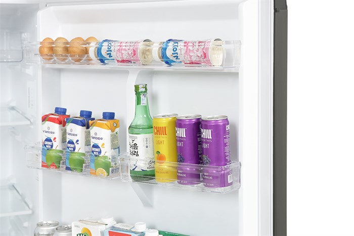 – Dung tích 304 lít, ngăn lạnh có các kệ, khay dạng trượt đựng thực phẩm tươi sống và ngăn đựng rau củ quả. Bên cạnh đó, trên cánh cửa còn có các khay để bạn tiện đặt trứng, mứt hoa quả, nước chấm, đồ uống,…